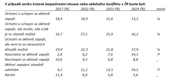 Zdroje dat: Středisko analýz a empirických průzkumů Sanep, s.r.o.; průzkumy na téma Bezpečnostní situace v ČR, reakce na krizové situace, branná výchova. Reprezentativní vzorky dotázaných respondentů 18+ (1917 – 16 371; 2022 – 36 567; 2023 – 27 651; 2024 – 2 450) odpovídali sociodemografickému rozložení obyvatel ČR dle údajů ČSÚ, statistická odchylka ±1,5 %.