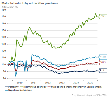 Za celý rok 2025 se útraty domácností za nepotravinářské zboží zvýšily o 4,4 %, přičemž hlavním tahounem byly opět internetové prodeje, které vzrostly téměř o 10 %. Naopak tržby za potraviny přidaly pouze 0,6 %. Tuzemské domácnosti šetří na potravinách dlouhodobě – oproti předpandemickému roku 2019 jsou jejich útraty stále o zhruba 9 % nižší.