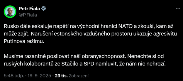 „Vypadněte z Ukrajiny a nepokoušejte naši trpělivost, vzkazuje česká diplomacie Rusku“ zní v nadpis webu Refresher . IDNES píše „Ruské stíhačky vpadly nad Estonsko, to aktivovalo žádost o pomoc NATO“ Hospodářské noviny zdůrazňují: >>„Bezprecedentně brutální vpád.“ Ruské stíhačky narušily estonský vzdušný prostor, Tallin aktivoval článek 4 smlouvy o NATO<< .