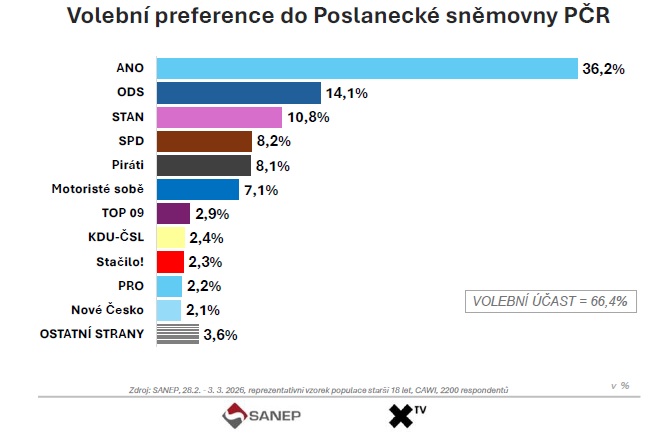 Průzkum agentury SANEP pro XTV ukazuje ANO na 36,2 %. Oproti volbám z roku 2025 jde o téměř dvouprocentní růst. Ostatní strany se drží blízko svých výsledků, na scéně se objevují i nové projekty.